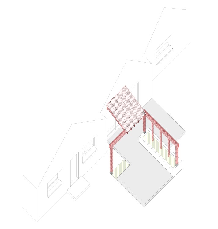 Design to make obvious entrance to existing dwelling, provide growing space for privacy and wind shelter, and provide shelter from rain